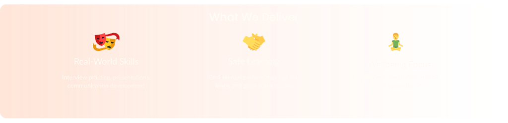 Through improv, role-play, and storytelling, we create safe spaces where people discover confidence, and essential life-skills. No script. No pressure. Just real growth, learned through creative expression.